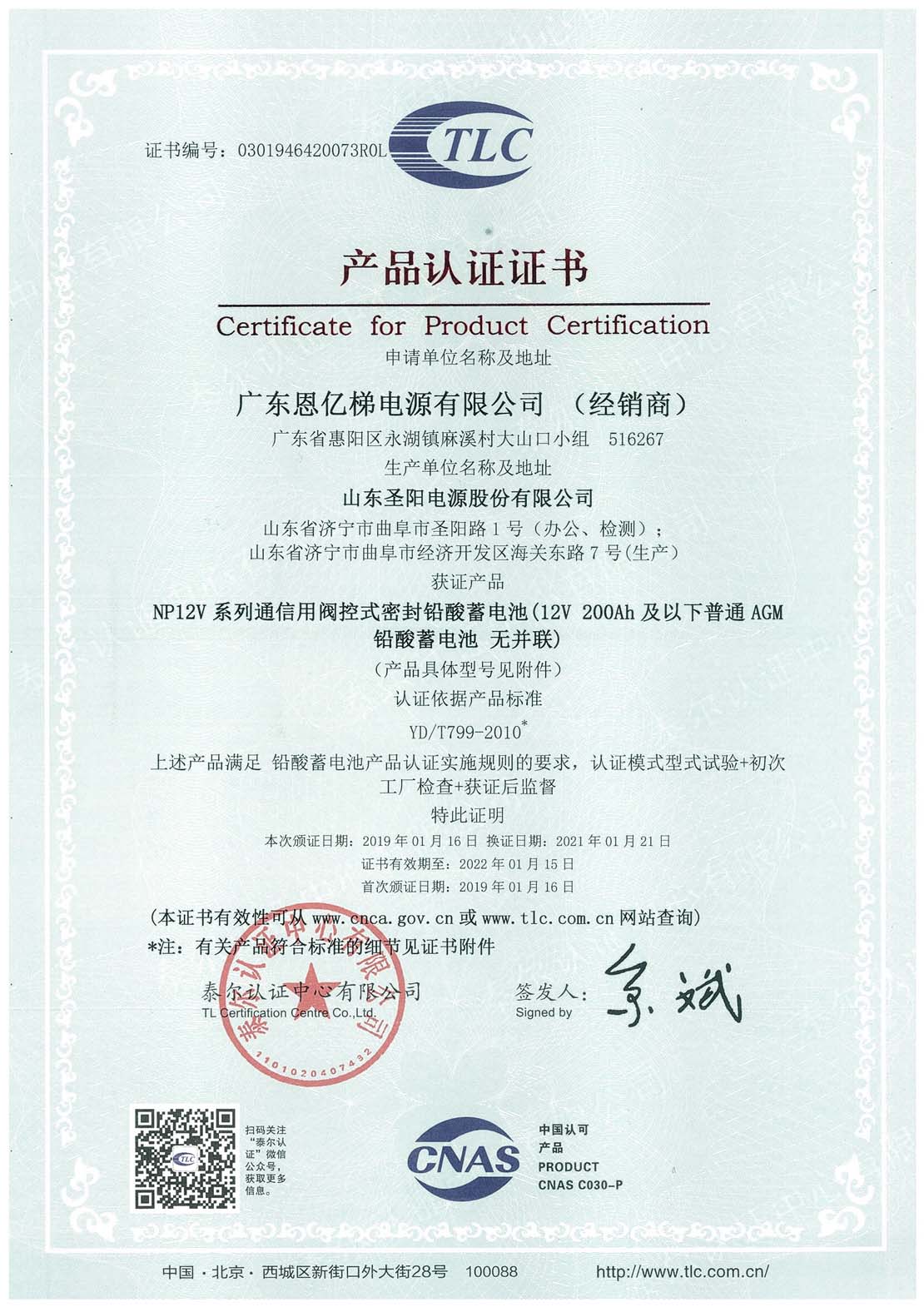 泰爾認證(閥控式密封鉛酸蓄電池)